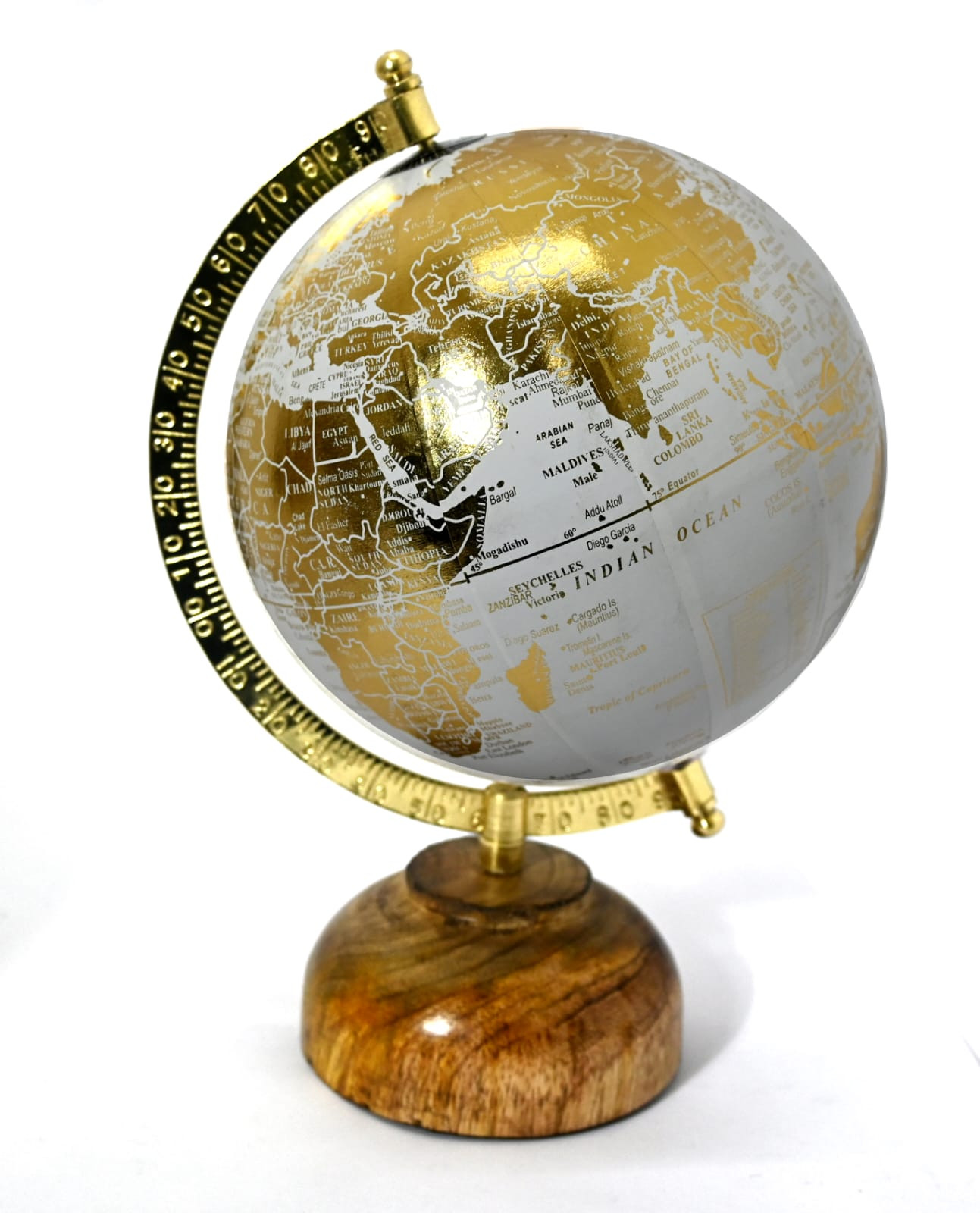 גלובוס קטן בצבע לבן עם רגל עץ