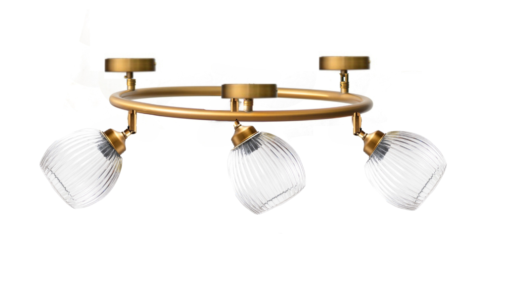 חישוק נחושת מחובר לתקרה עם שלושה רוזטות נחושת ומהחישוק יוצאים שלושה חובקי ניו מתכוננים.