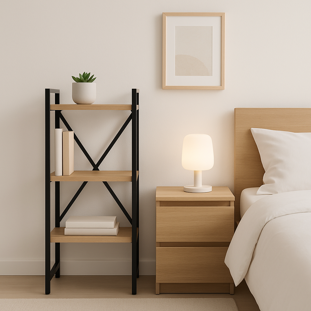כוננית שחורה בצורת איקס עם שלושה שלבי מידוף מעץ.