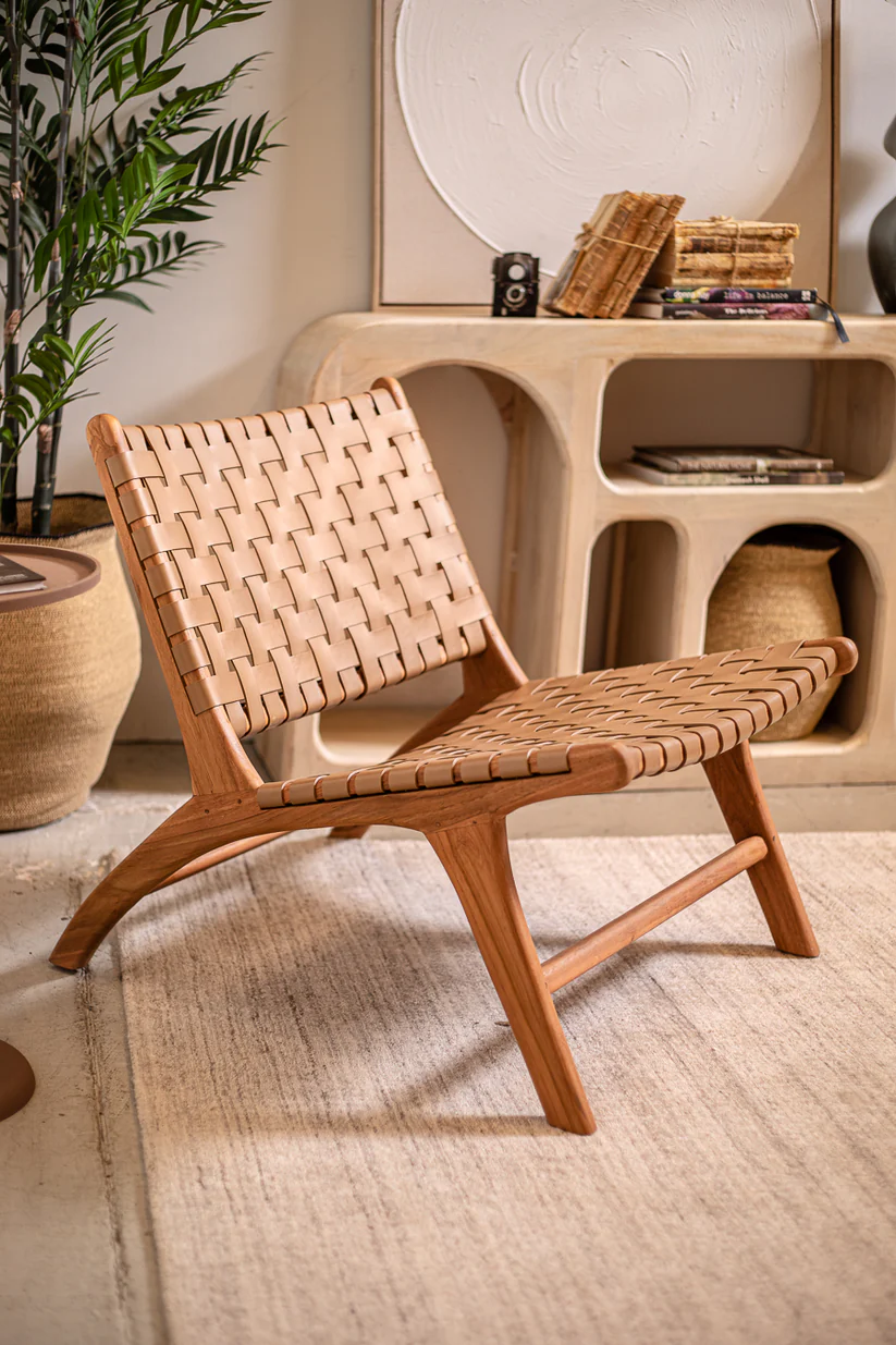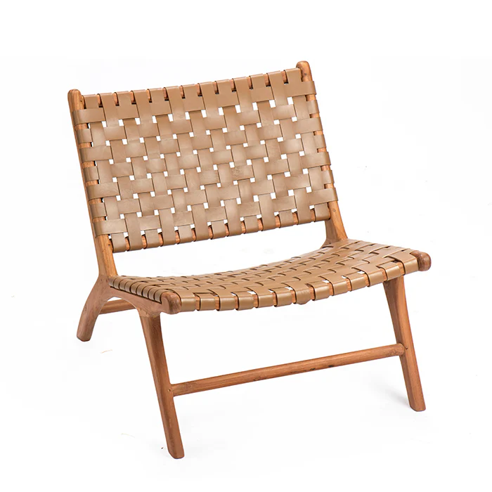 כורסת עור לאונג' קלוע בגוון ניוד. כיסא טרקלין מעוצב קליעת עור בדיגום שתי וערב, הנישא על רגליי עץ טיק. כורסה מדויקת לאוהבי העיצוב הקלאסי.