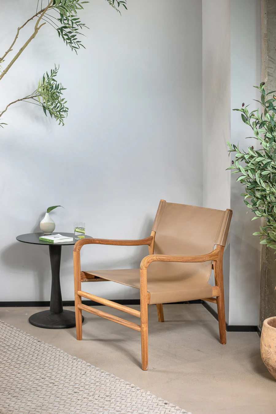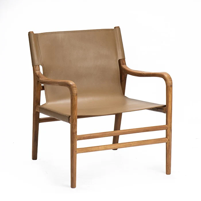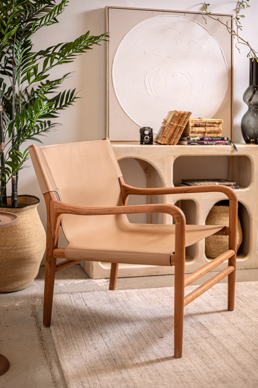 כורסת עור one piece בגוון ניוד. כיסא טרקלין חתרני מעוצב עור חלק, הנישא על רגליי עץ טיק.