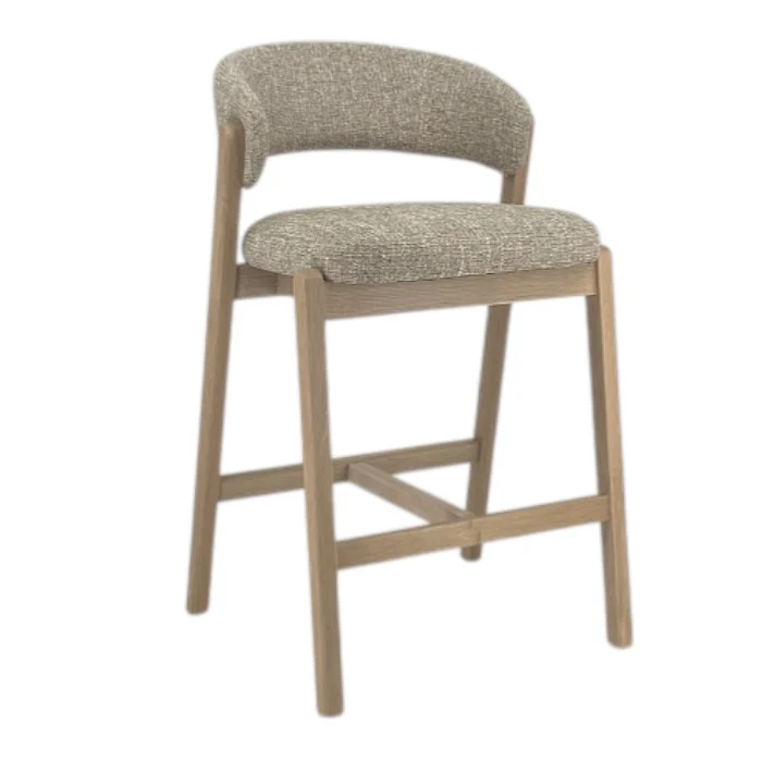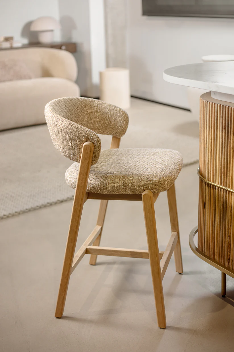 כיסא בר אלסנדרו בגוון בהיר. כיסא ישיבה גבוה, מעוצב משענת ומושב מרופדים בקו רטרו עכשווי.
