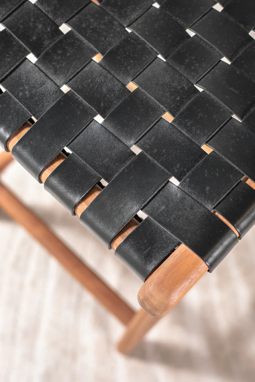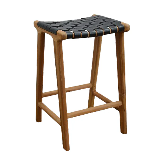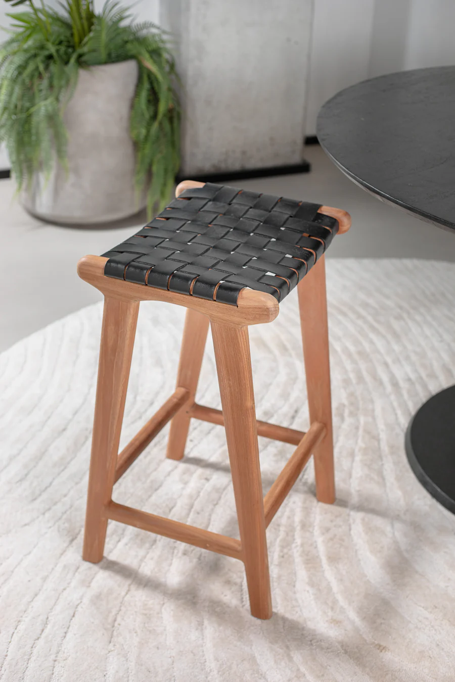 כיסא בר עור קלוע בצבע שחור. כיסא מעוצב עור קלוע, הנישא על רגליי עץ טיק. מתאים לאוהבי העיצוב הקלאסי עם טוויסט.