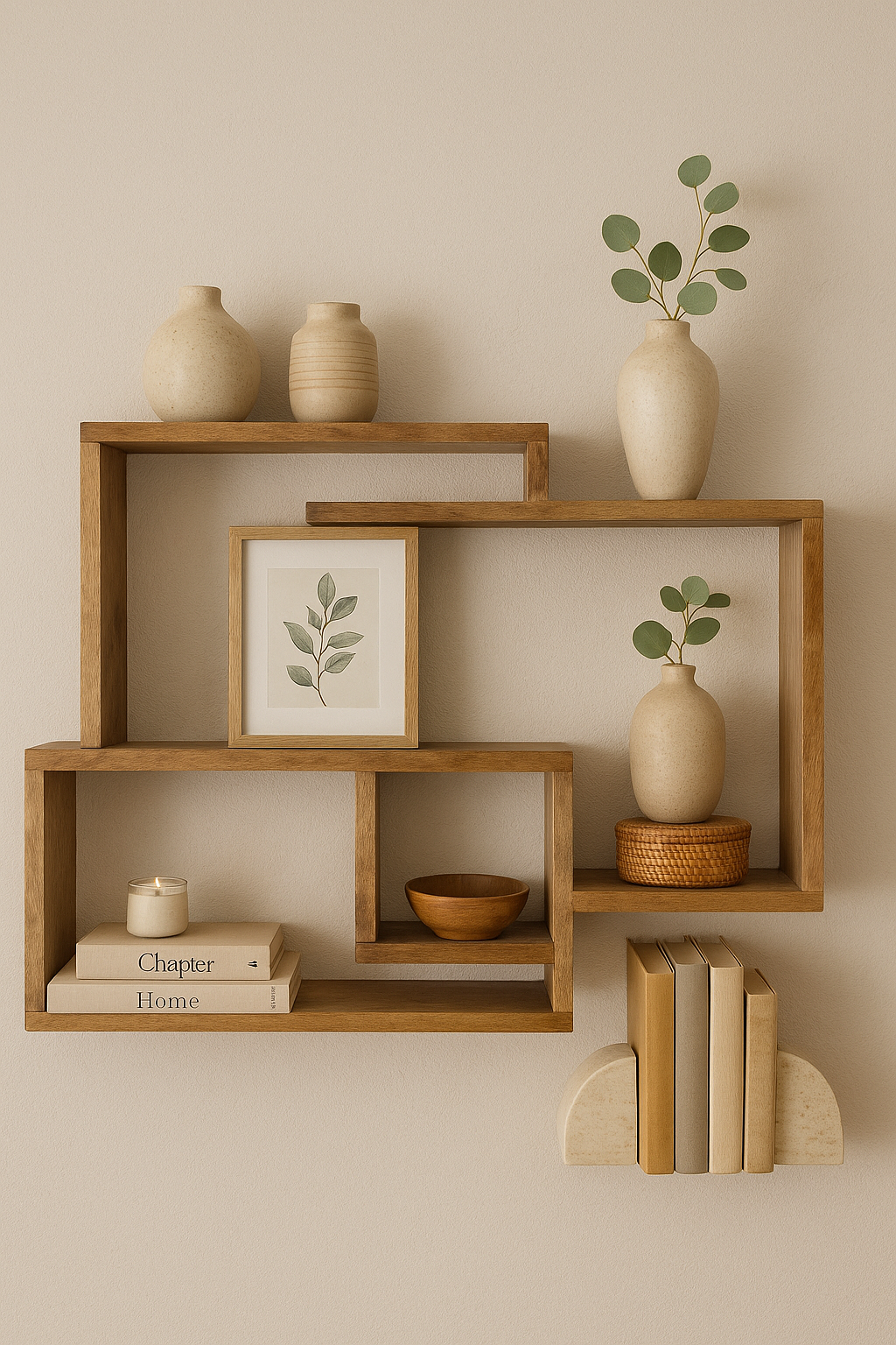 מדף עץ מחובר ומעוצב בסגנון מודרני עם הרבה סטייל שיקפיץ כל חלל חדר.