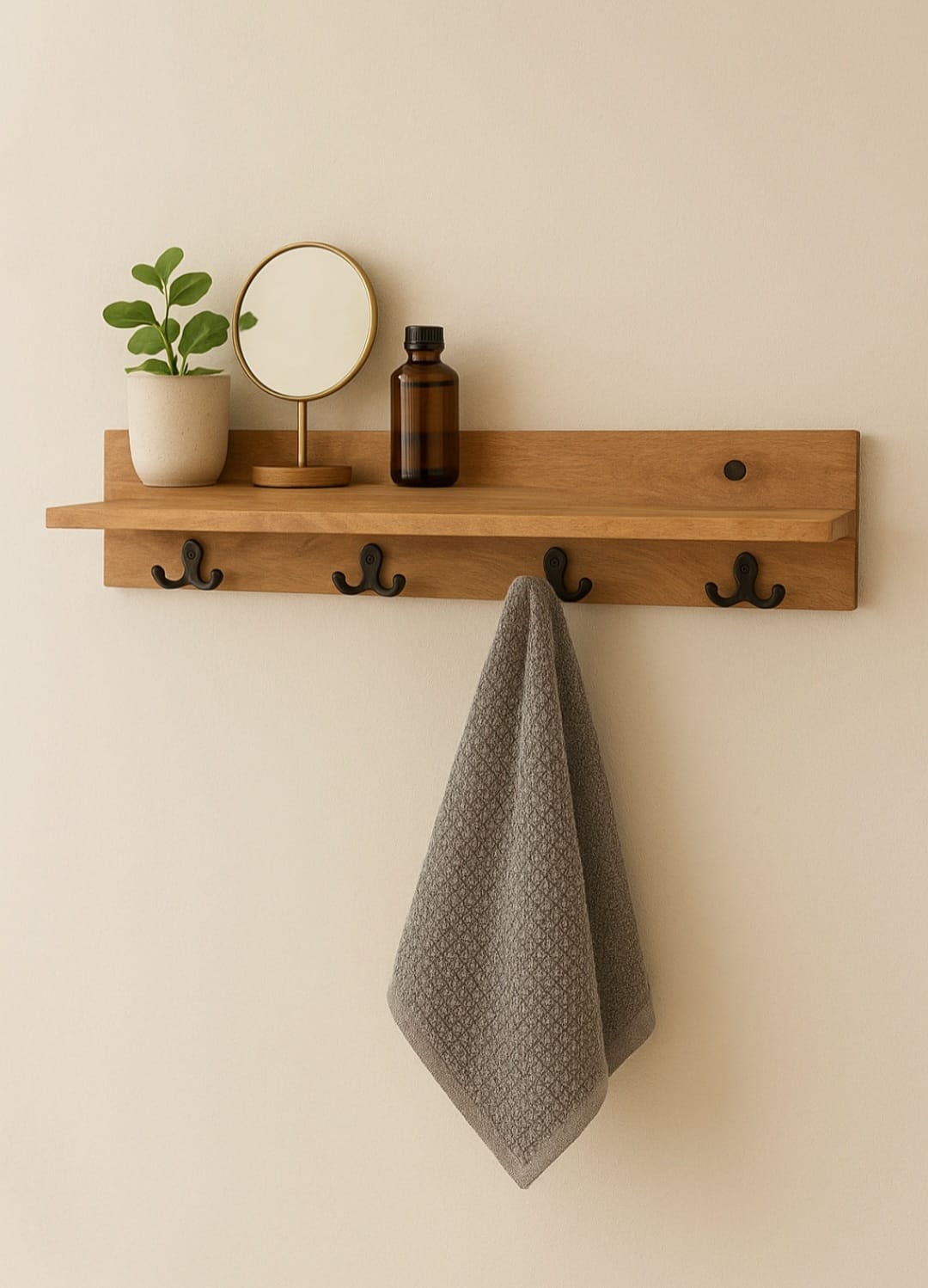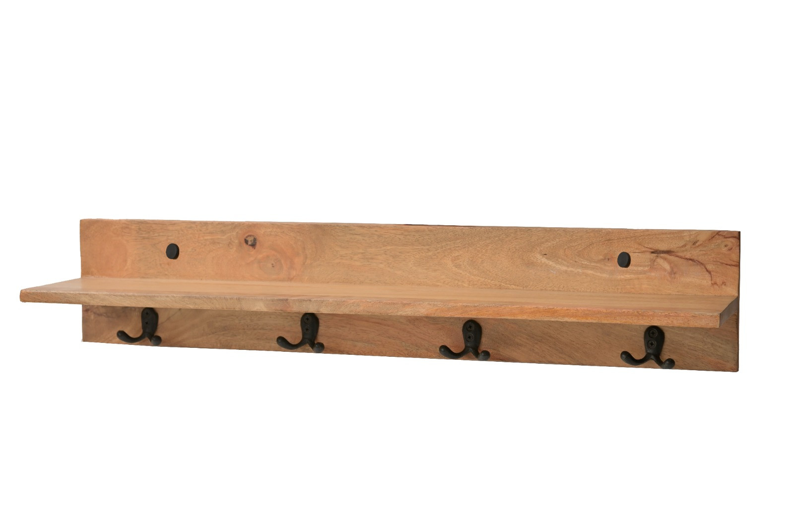 מדף מעוצב מעץ מנגו מלא. משמש גם כמדף וגם עם ווים לתלייה מתחת למדף. מוצר שימושי ונוח לתלייה.