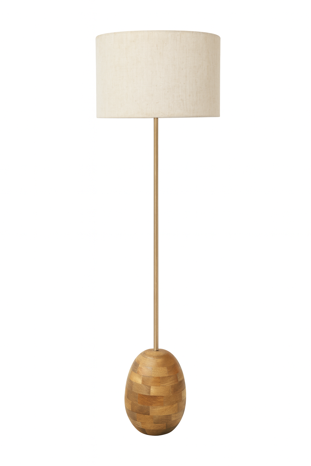 מנורה עומדת על רגל עץ דקורטיבית עם האהיל בד לבן.