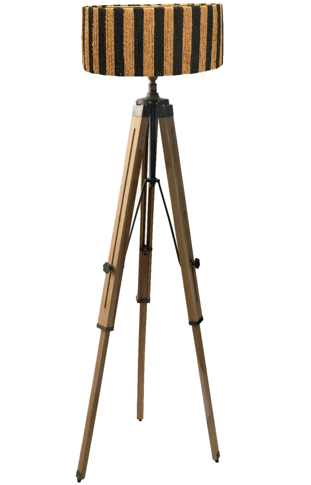 מנורה עומדת על שלושה רגלי עץ מתכווננים מדגם סטריפס עם הכובע אהיל שחור חום מדגם 985.