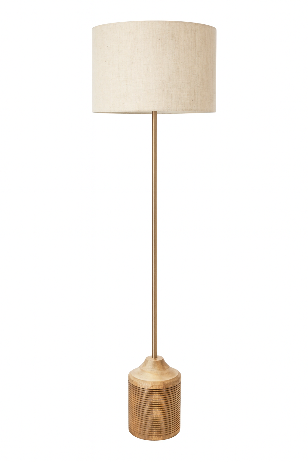 מנורה עומדת על רגל עץ דקורטיבית עם נחושת עם האהיל בד לבן.