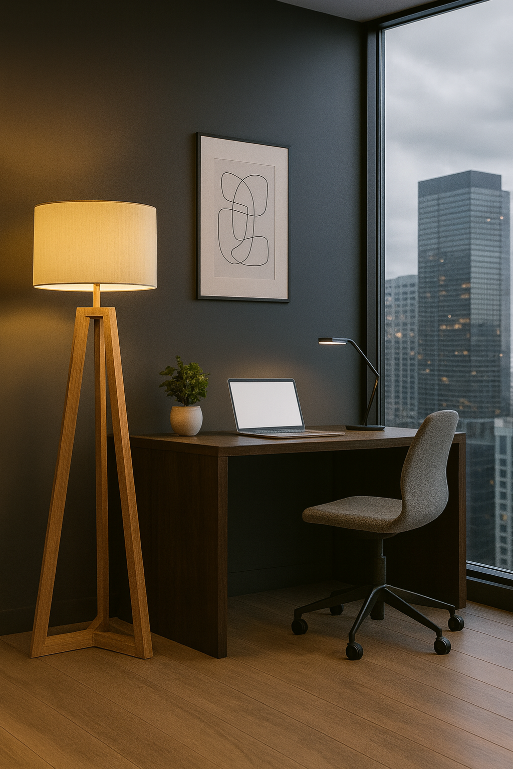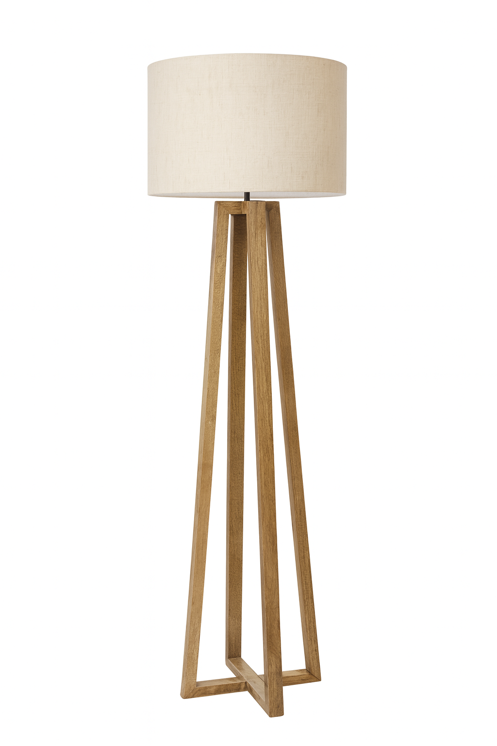 מנורה עומדת על רגל עץ דקורטיבית עם האהיל בד לבן.