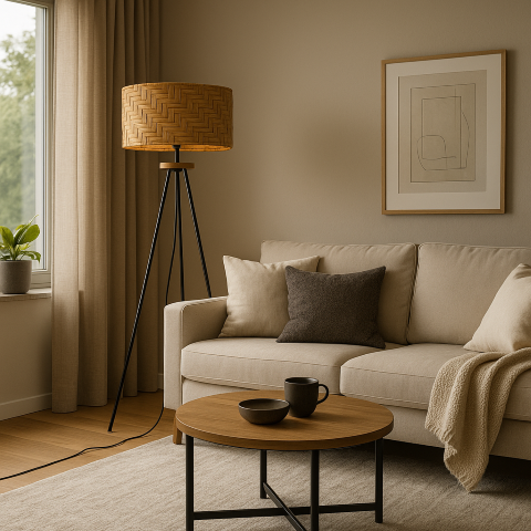 מנורה עומדת על שלושה רגלי ברזל שחורות עם האהיל קש.