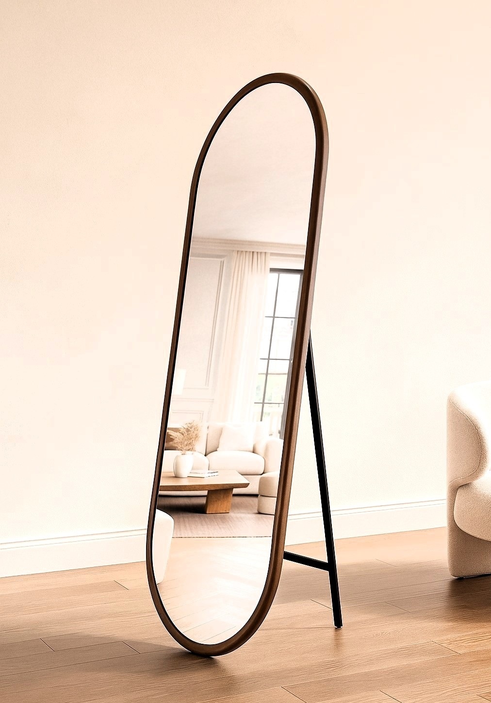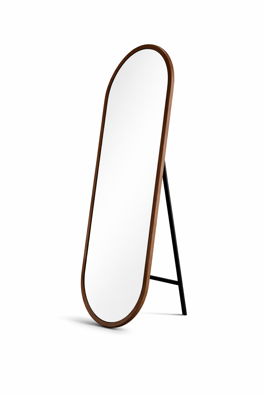 מראה עומדת עם מסגרת עץ אגוז מלא, בצורה אובלית.
