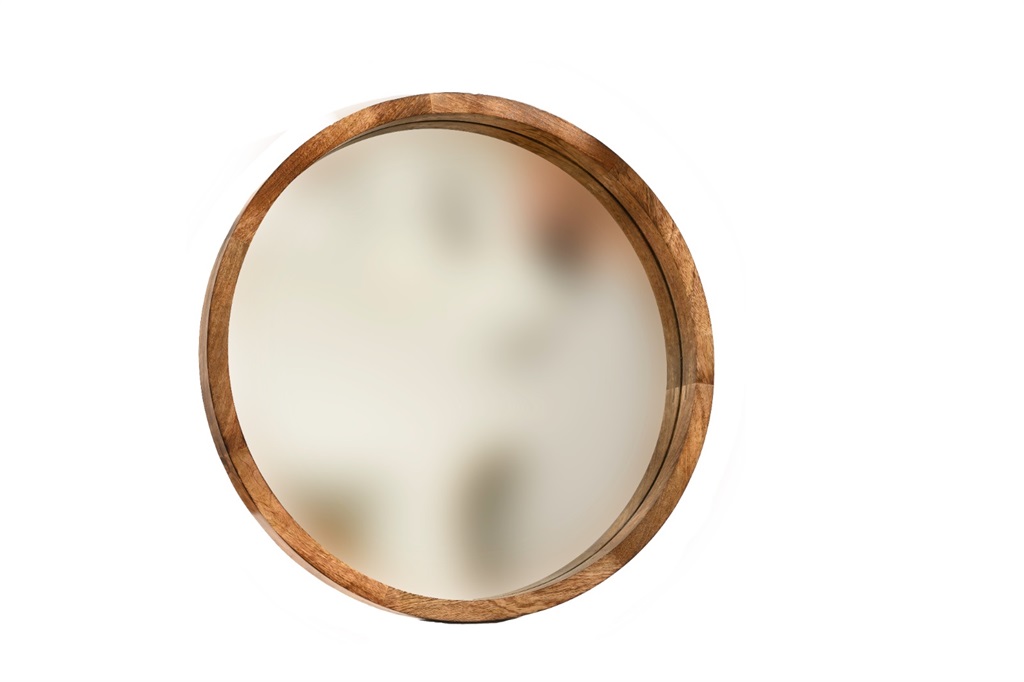 מראה עגולה עם מסגרת עץ מעץ מנגו טיבעי. נוח וקל לתלייה.