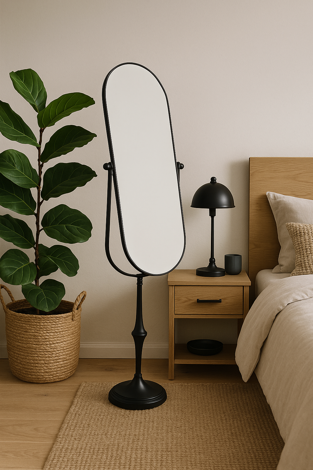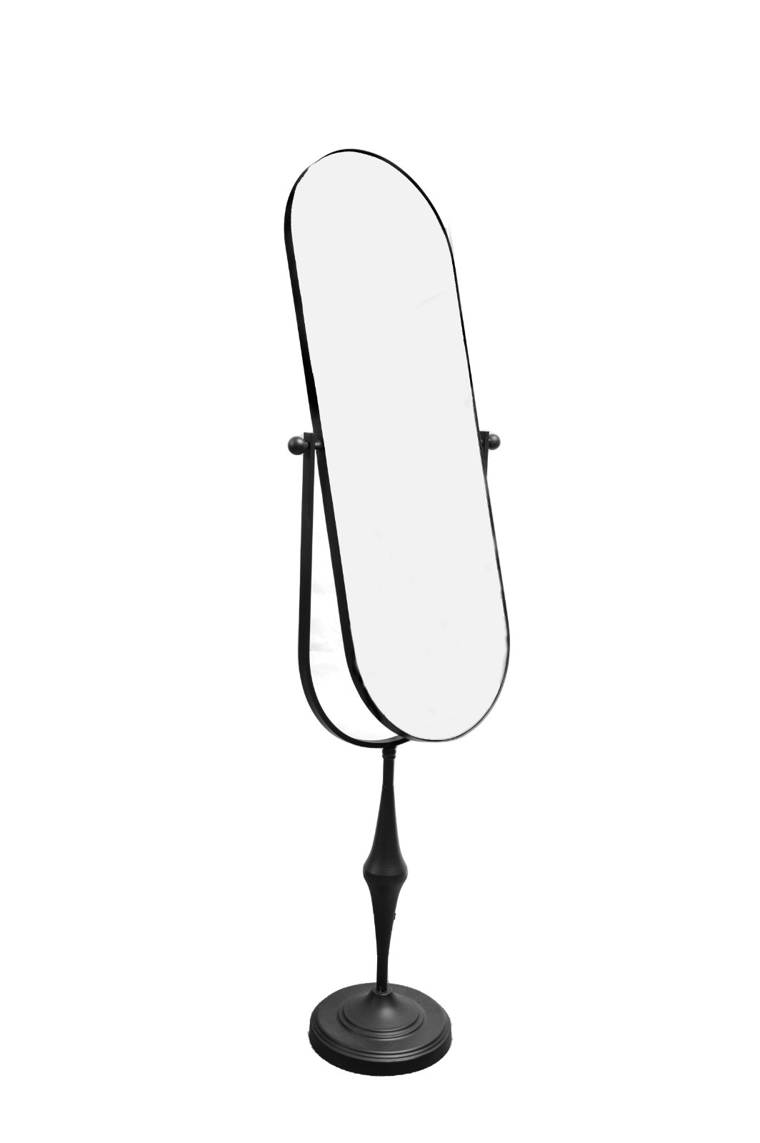 מראה אובלית בצבע שחור עומדת על רגל שחורה. מוצר מאוד קלאסי ומתאים לרוב חללי הבית.