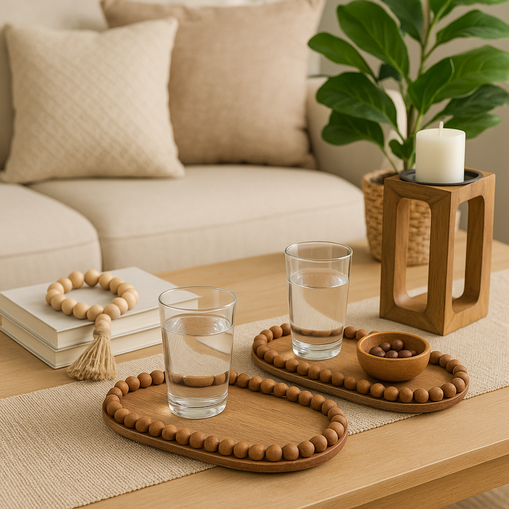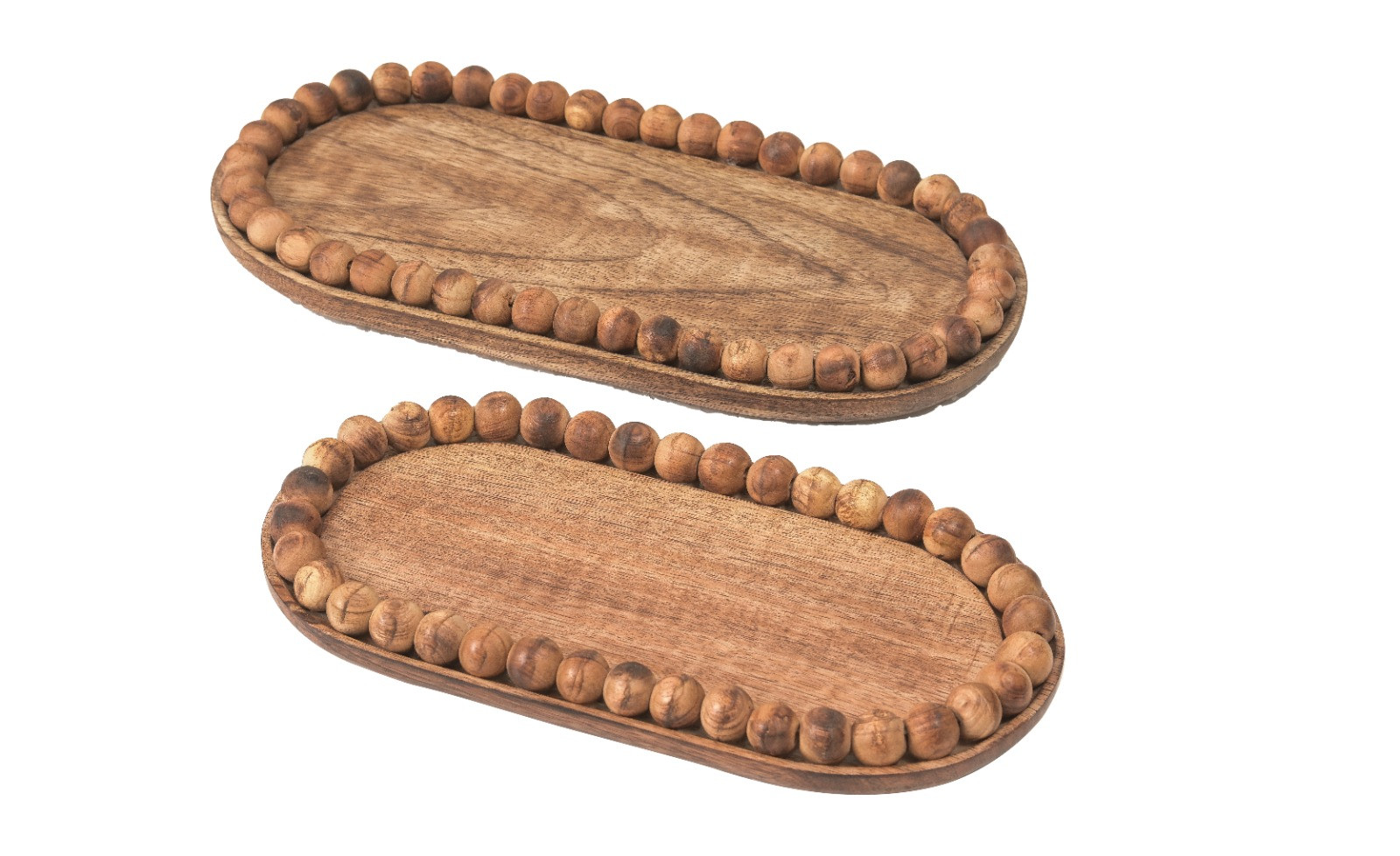 סט זוגי מגשי עץ אובליים עם פרזולי כדורי עץ מסביב.