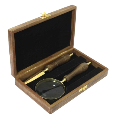 קופסת מתנה זוגית מעץ עם זכוכית מגדלת וסכין לפתיחת מעטפות.
