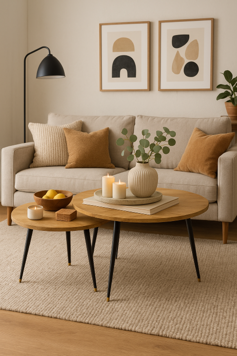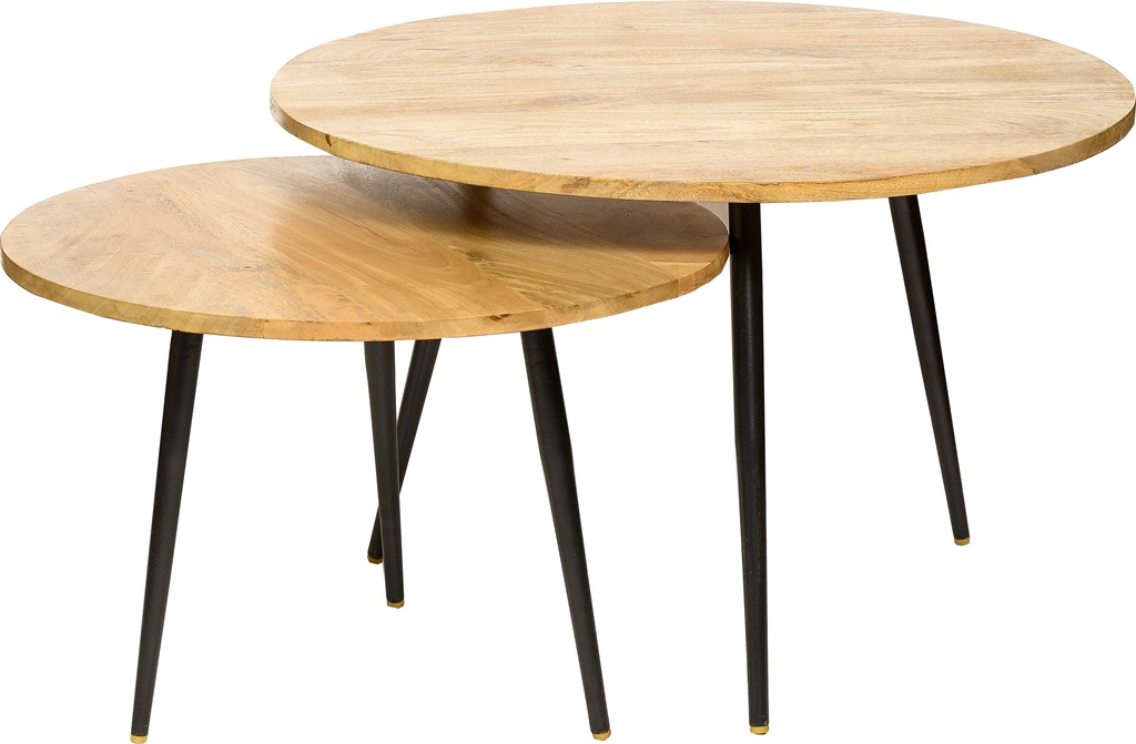 סט זוגי של שולחנות עץ עם רגלי מתכת שחורות.