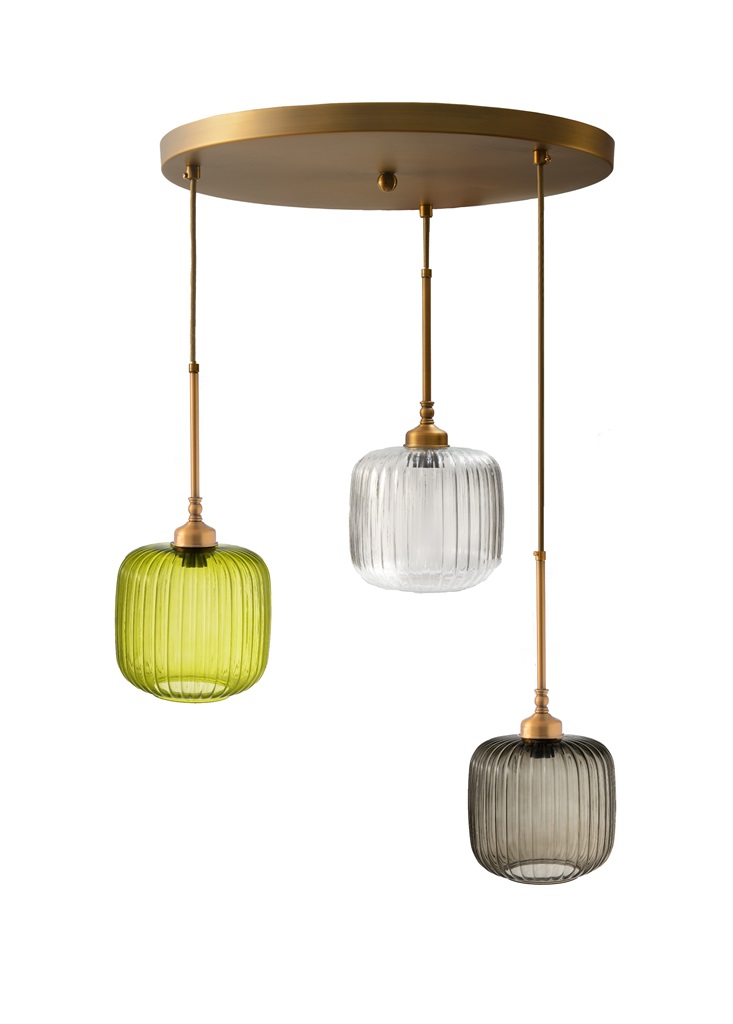 צלחת נחושת מחושמל עם שלישיית חובקים עם כבלי בד נחושת עם שלושה זכוכיות בצבעים-ירוק אפור ושקוף.
