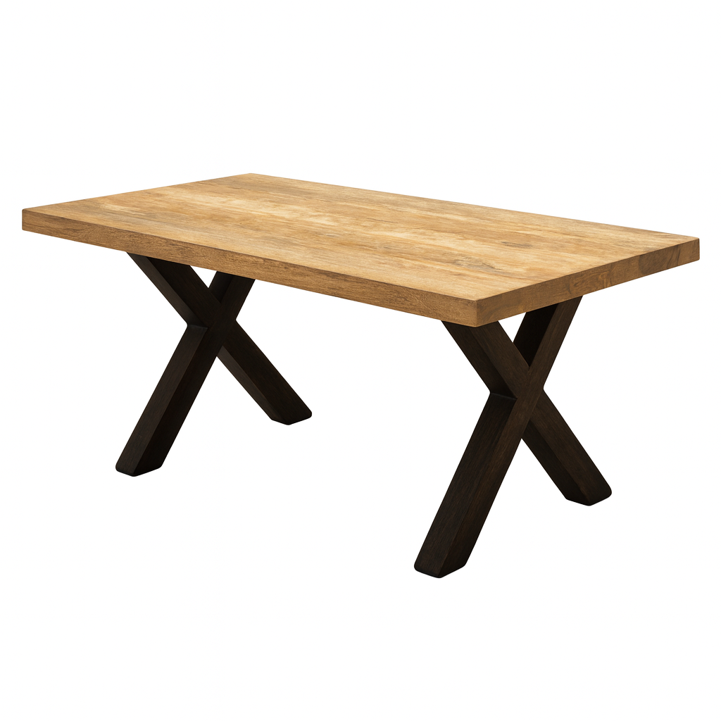 שולחן מעץ מנגו מלא עם רגלי מתכת שחורים בצורת איקס משני הצדדים.
