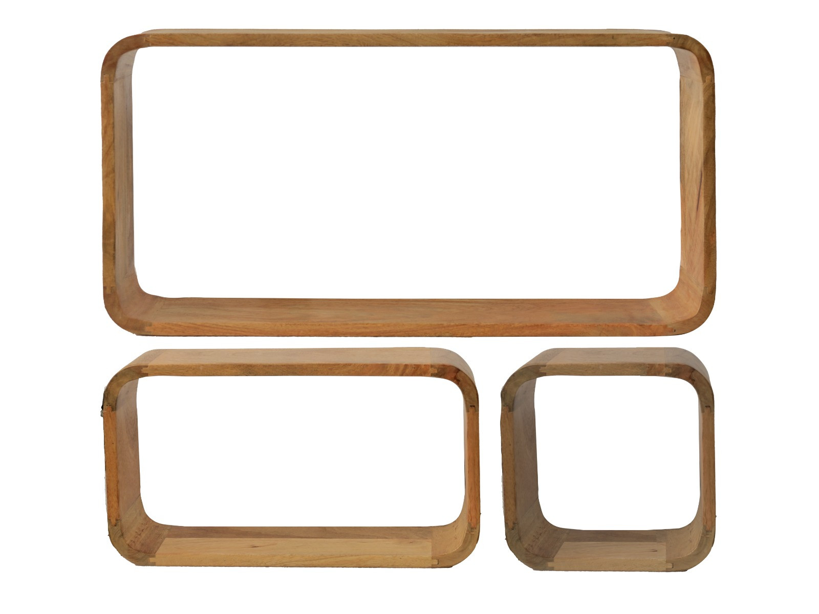שלישיית מדפי עץ בגדלים שונים של מרובע מעוגל. מוצר קל לתלייה ומאוד פרקטי.