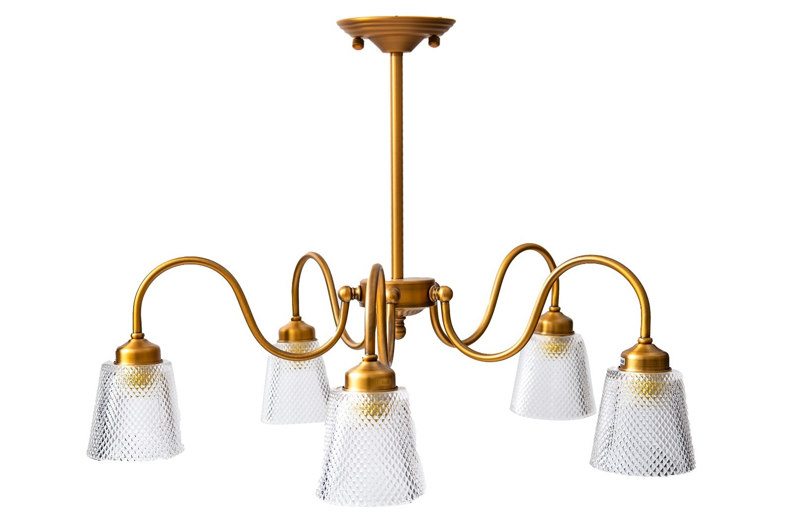 שנדליר חמישייה הפוך על מוט נחושת עם חמישיית זכוכיות.