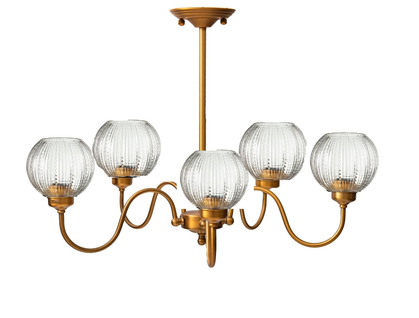 שנדליר חמישייה על מוט נחושת עם חמישיית זכוכיות מדגם 717.