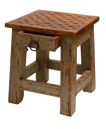שרפרף עץ עם מגירה נפתחת בצבע אפור.