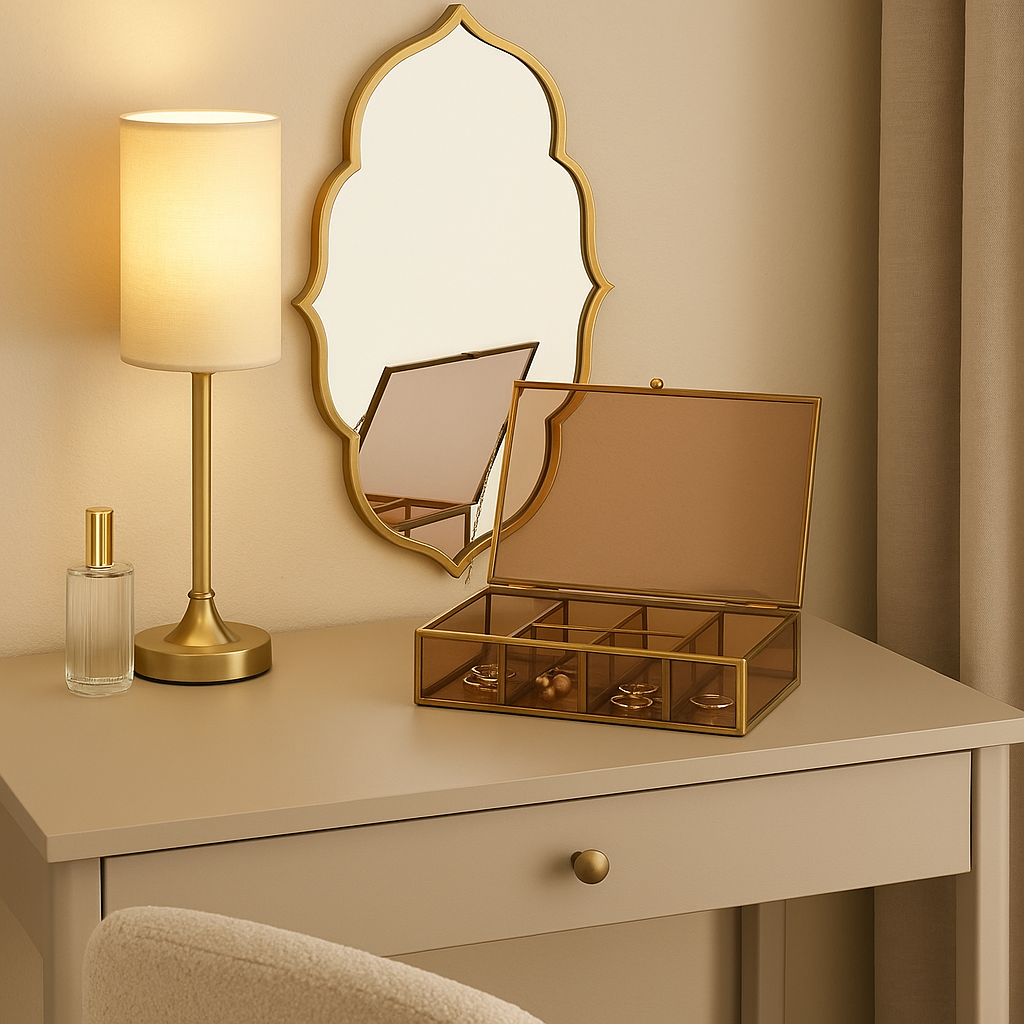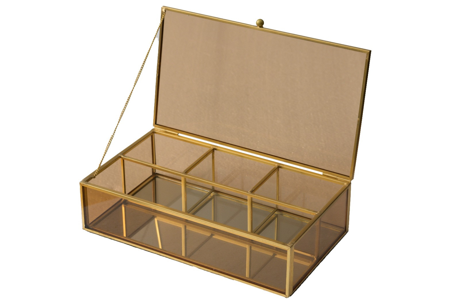 תיבת תכשיטים בצבע אמבר עם חלוקה בפנים ל4 חלקים.